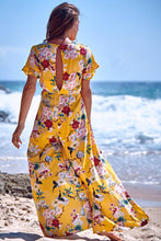 - V neck line - Buttoned bodice - Short frilled sleeve with crochet trim - Elastic waist with tie - Keyhole back opening with button - Wide leg pant with side splits - Floor length